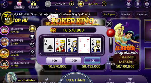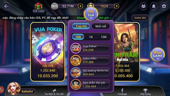 + Game slot: Hấp dẫn, mới lạ và là cái tên được săn lùng nhiều nhất hiện nay. Các hũ được nổ liên tục, đưa người chơi vào những câu chuyện cổ tích hấp dẫn, mới lạ, mang đến trải nghiệm hết sức thú vị với một số tựa game như: Vị thần Ai Cập, Aladdin, Nữ hoàng Nefertiti, Đèn thần đại gia,….