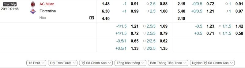 Bảng Tỷ lệ kèo bóng đá AC Milan vs Fiorentina