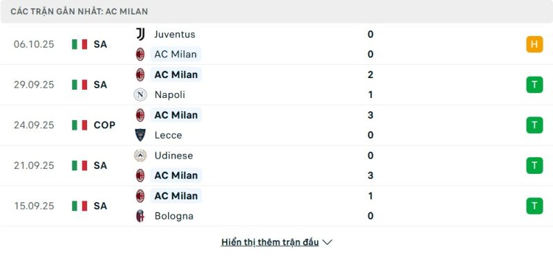 5 trận gần nhất của AC Milan: D-W-W-W-W