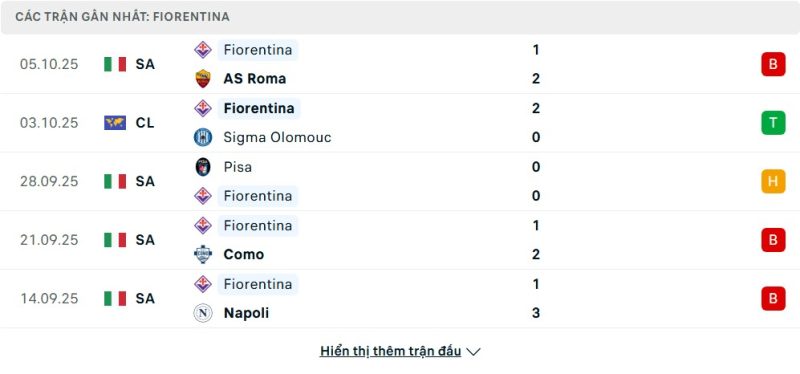 5 trận gần nhất của Fiorentina: L-W-D-L-L