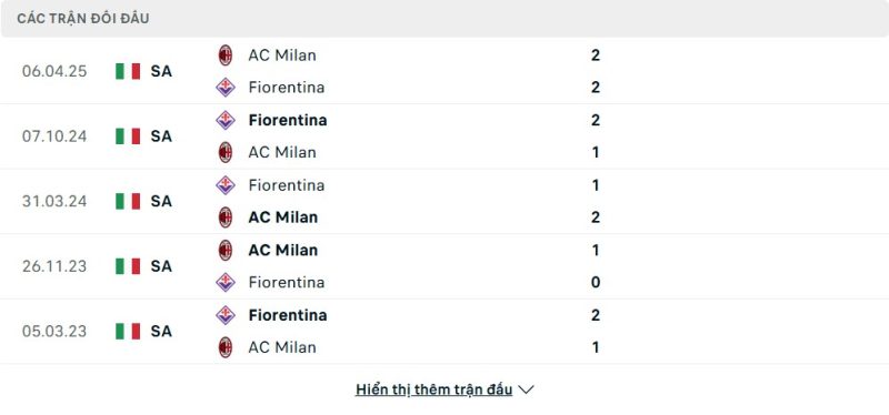 Thành tích đối đầu của AC Milan vs Fiorentina