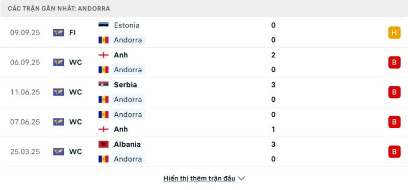 Andorra đang trải qua một kỳ vòng loại World Cup vô cùng khó khăn khi chưa thể giành được bất kỳ điểm số nào sau 5 lượt trận. Họ đang đứng cuối bảng K với thành tích toàn thua, ghi được 0 bàn thắng và để thủng lưới tới 10 lần. Chuỗi trận đáng thất vọng này kéo dài từ các trận đấu trước đó, khi họ cũng chỉ có được những kết quả hòa và thua. Trận hòa 0-0 trước Estonia trong một trận giao hữu gần đây là điểm sáng hiếm hoi, nhưng nó không thể che lấp đi sự yếu kém toàn diện của đội bóng này.