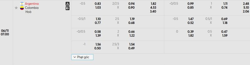 Bảng Tỷ lệ kèo bóng đá Argentina vs Colombia