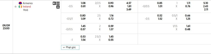 Bảng Tỷ lệ kèo bóng đá Armenia vs Ireland