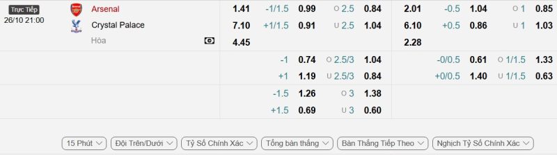 Bảng Tỷ lệ kèo bóng đá Arsenal vs Crystal Palace