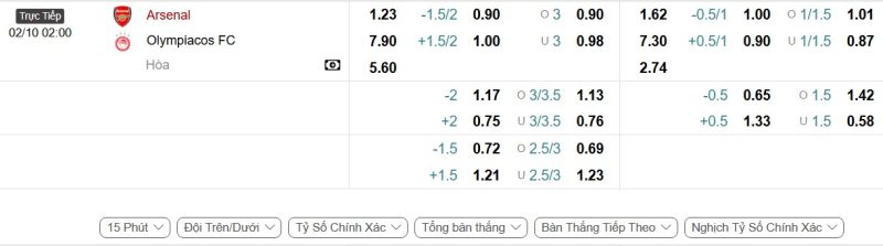 - Kèo tỷ số bóng đá hiệp 1: Arsenal 2-0 Olympiacos