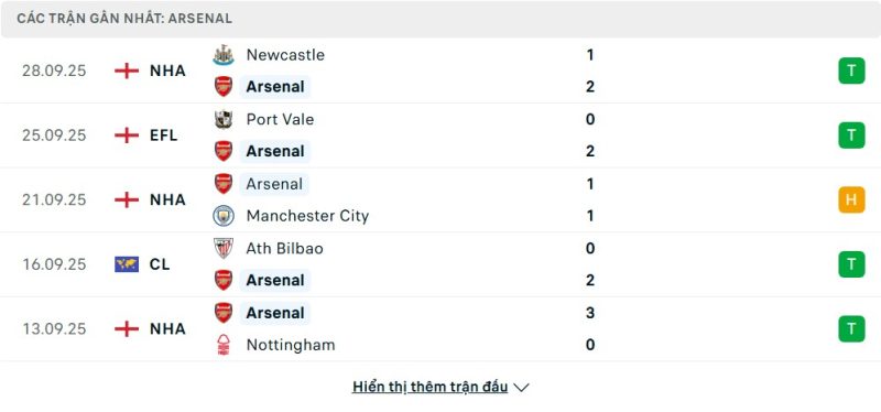 Arsenal đang cho thấy sự ổn định ấn tượng ở mùa giải mới khi liên tục gặt hái kết quả tích cực. Tại Premier League, họ vượt qua Newcastle và Leeds với màn trình diễn thuyết phục, đồng thời chia điểm trước Man City trong thế trận cân bằng. Ở Champions League, đội bóng đến từ Anh đã có khởi đầu thuận lợi bằng chiến thắng trên sân Athletic Club, qua đó nhanh chóng chiếm vị trí khả quan trong bảng xếp hạng. Chuỗi kết quả tích cực này phản ánh sự tự tin, lối chơi ngày càng gắn kết và phong độ ổn định của Arsenal trong giai đoạn đầu mùa.