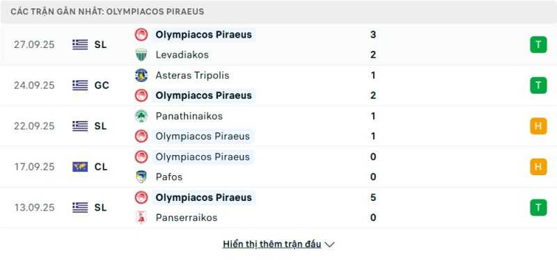 5 trận gần nhất của Olympiacos: W-W-D-D-W