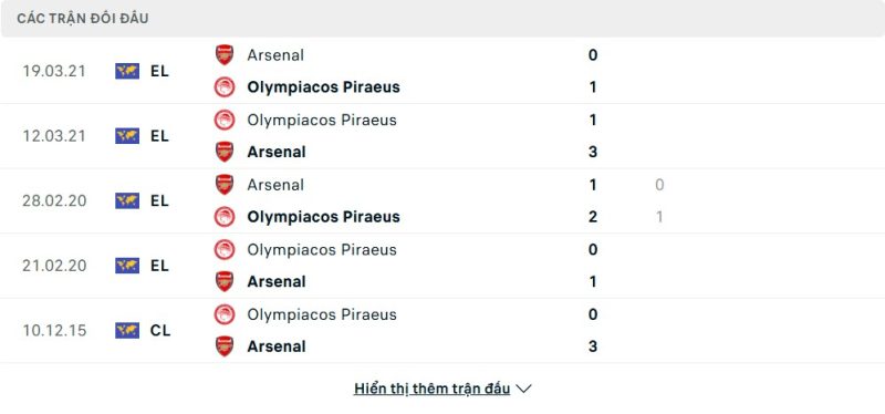Thành tích đối đầu của Arsenal vs Olympiacos