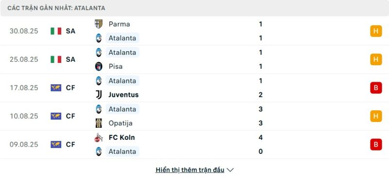 5 trận gần nhất của Atalanta: D-D-L-D-L