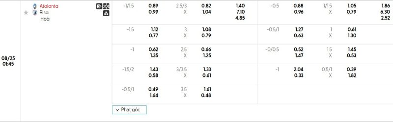 Bảng Tỷ lệ kèo bóng đá Atalanta vs Pisa