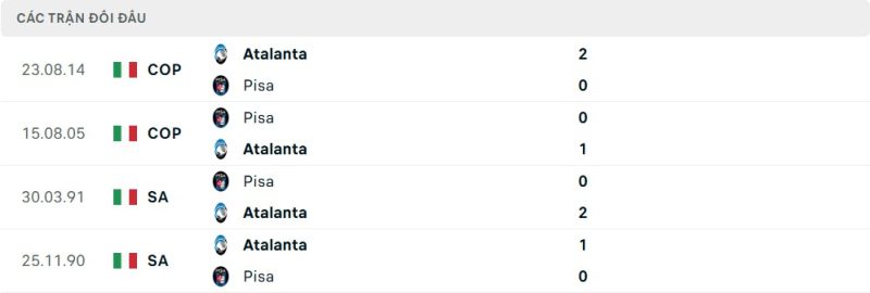 Thành tích đối đầu của Atalanta vs Pisa
