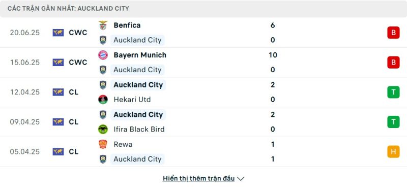 5 trận gần nhất của Auckland City: L-L-W-W-D