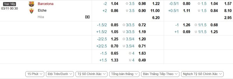 Bảng Tỷ lệ kèo bóng đá Barcelona vs Elche