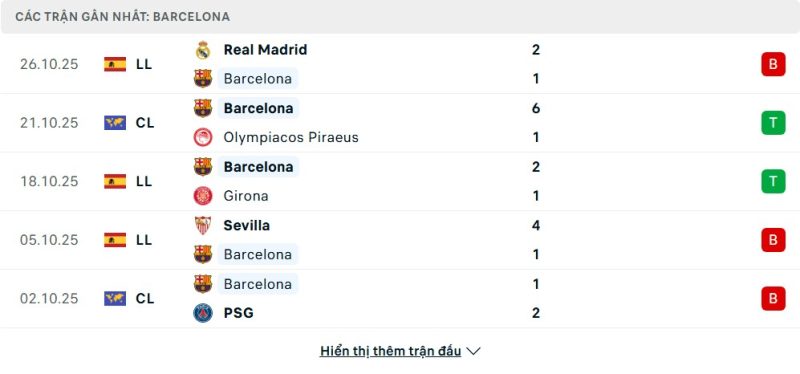 5 trận gần nhất của Barcelona: L-W-W-L-L
