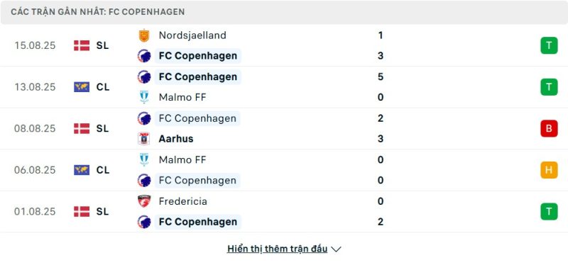 5 trận gần nhất của Copenhagen: W-W-L-D-W