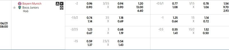 Bảng Tỷ lệ kèo bóng đá Bayern Munich vs Boca Juniors