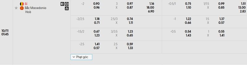 Bảng Tỷ lệ kèo bóng đá Bỉ vs Bắc Macedonia