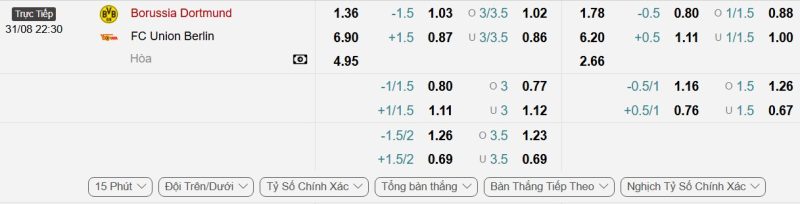 - Kèo tỷ số bóng đá hiệp 1: Borussia Dortmund 3-1 Union Berlin