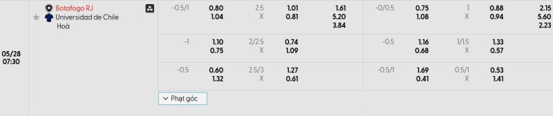 Bảng Tỷ lệ kèo bóng đá Botafogo vs Universidad de Chile