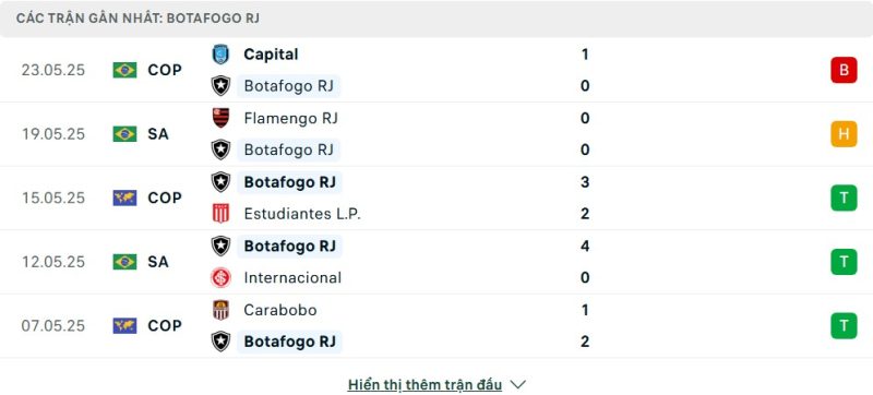 Thống kê phong độ gần đây Botafogo vs Universidad de Chile