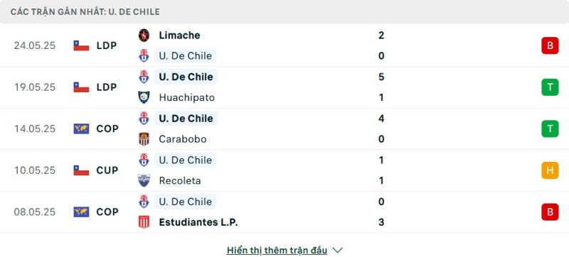 5 trận gần nhất của Universidad de Chile: L-W-W-D-L