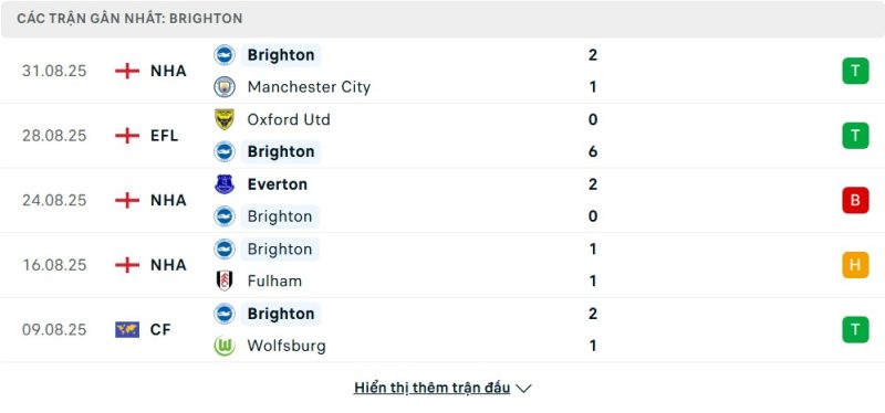 5 trận gần nhất của Brighton & Hove Albion: W-W-L-D-W