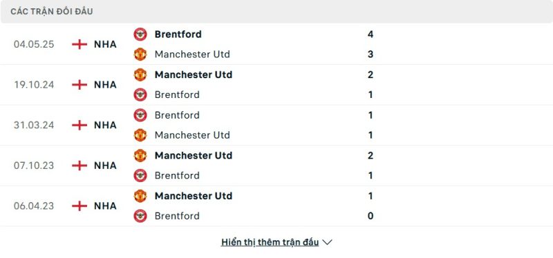 Thống kê phong độ gần đây Brentford vs Manchester United