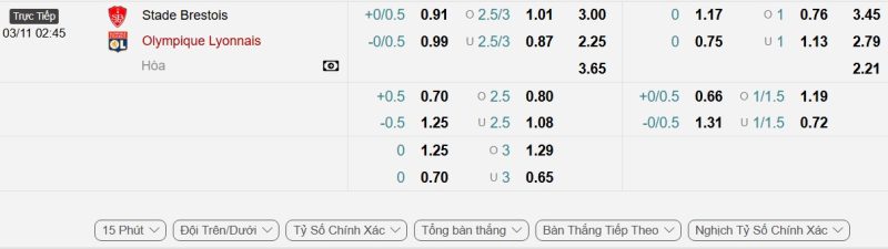 - Kèo tỷ số bóng đá hiệp 1: Brest 1-2 Lyon