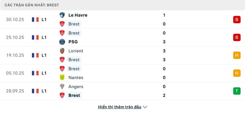 Brest đang trải qua giai đoạn khó khăn tại Ligue 1 mùa này. Sau 10 vòng đấu, đội chủ sân Stade Francis-Le Blé mới chỉ giành được 9 điểm và đang đứng ở vị trí thứ 14 trên bảng xếp hạng, ngay sát nhóm nguy hiểm. Phong độ của thầy trò Eric Roy thực sự đáng báo động khi họ đã trải qua 4 trận liên tiếp không biết mùi chiến thắng, trong đó có 2 trận hòa và 2 trận thua. Đáng lo ngại hơn, cả hai thất bại gần nhất trước PSG và Le Havre đều chứng kiến hàng công của Brest hoàn toàn im tiếng và không thể ghi bàn.