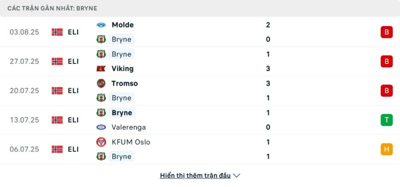 Bryne đang chìm trong chuỗi phong độ yếu kém với ba trận thua liên tiếp, trong đó có hai thất bại nặng nề trước Viking và Molde. Đáng chú ý, họ đã không ghi được bàn nào ở hai trận gần nhất, trong khi hàng thủ thường xuyên để lộ khoảng trống lớn. Trận thắng duy nhất gần đây là trước Valerenga, nhưng đó có thể coi là điểm sáng hiếm hoi giữa một giai đoạn đầy bất ổn. Đứng sát nhóm cuối bảng, Bryne đang chịu nhiều áp lực tâm lý và chưa tìm ra cách xoay chuyển tình thế.
