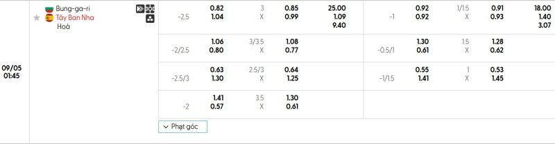 Bảng Tỷ lệ kèo bóng đá Bulgaria vs Tây Ban Nha