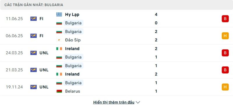5 trận gần nhất của Bulgaria: L-D-L-L-D