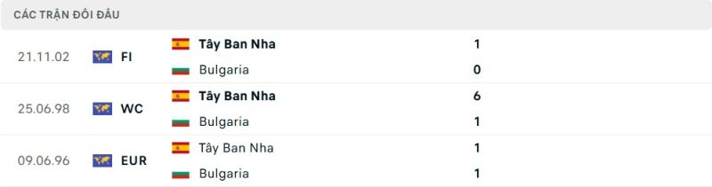 Thành tích đối đầu của Bulgaria vs Tây Ban Nha
