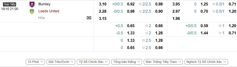 Bảng Tỷ lệ kèo bóng đá Burnley vs Leeds United