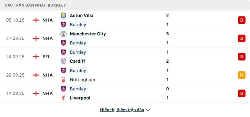 5 trận gần nhất của Burnley: L-L-L-D-L