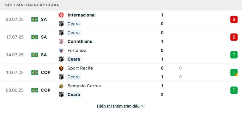 5 trận gần nhất của Ceará: L-L-W-D-W