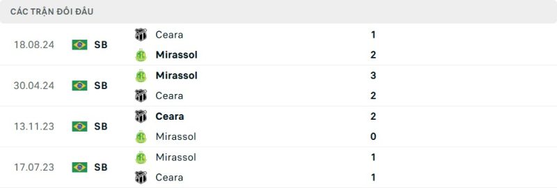 Thành tích đối đầu của Ceará vs Mirassol