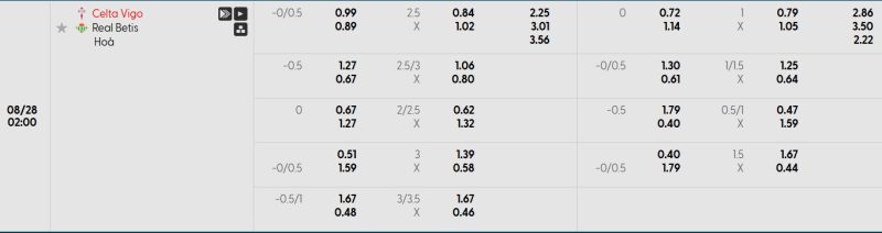 Bảng Tỷ lệ kèo bóng đá Celta Vigo vs Real Betis