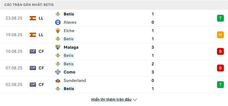 5 trận gần nhất của Real Betis: W-D-L-L-W