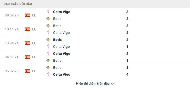 Thành tích đối đầu của Celta Vigo vs Real Betis