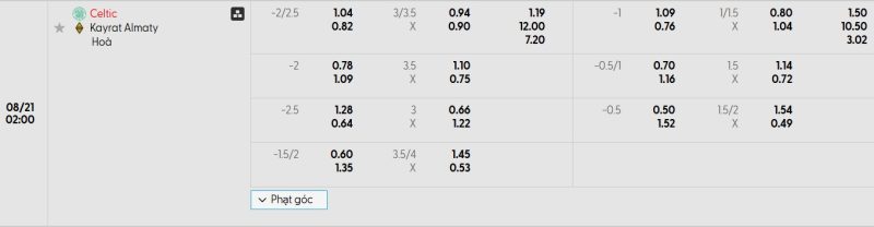 Bảng Tỷ lệ kèo bóng đá Celtic vs Kairat