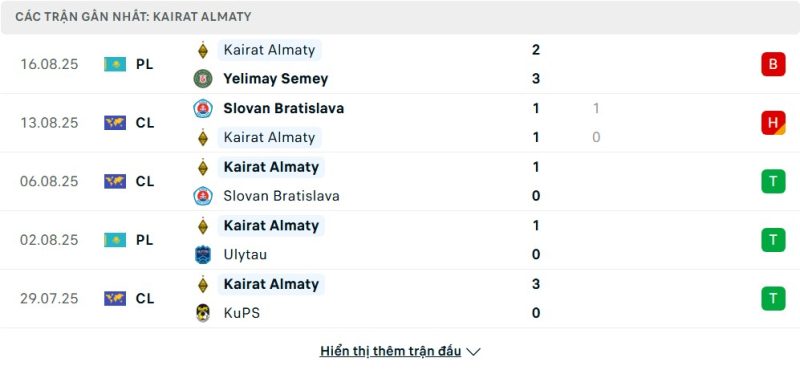 5 trận gần nhất của Kairat: L-D-W-W-W