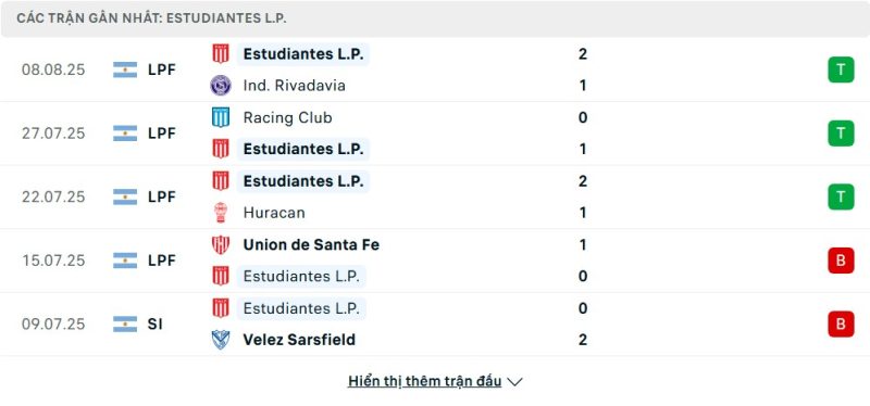5 trận gần nhất của Estudiantes de La Plata: W-W-W-L-L