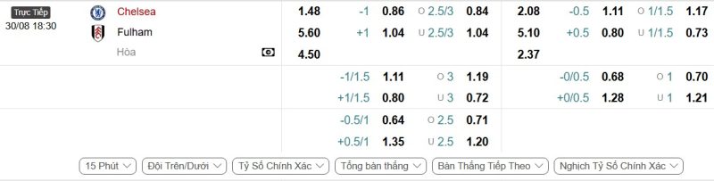 Bảng Tỷ lệ kèo bóng đá Chelsea vs Fulham