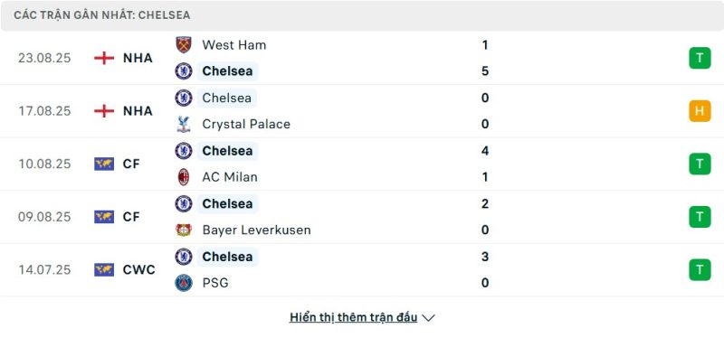 5 trận gần nhất của Chelsea: W-D-W-W-W