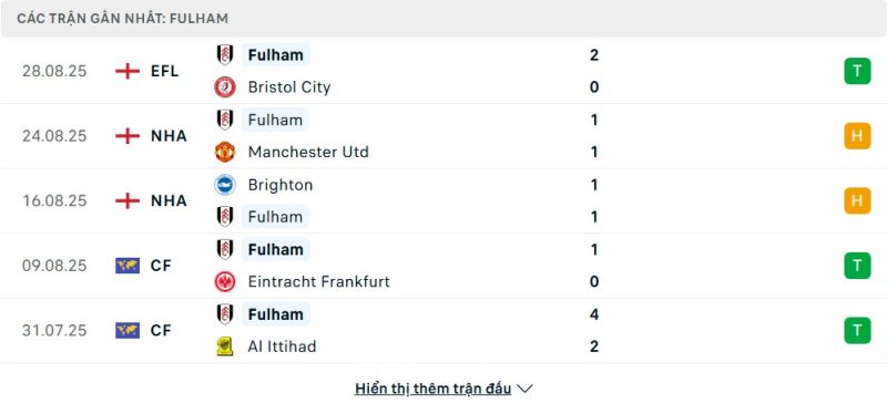 Bên kia chiến tuyến, Fulham cũng đang cho thấy mình là một đối thủ không hề dễ bị bắt nạt. Dù chỉ đang đứng ở vị trí thứ 13, đội khách đã có được 2 điểm quý giá sau hai trận hòa kiên cường. Đáng chú ý, Fulham đã cầm chân những đối thủ rất mạnh là Manchester United và Brighton với cùng tỷ số 1-1. Những kết quả này cho thấy một lối chơi đầy kỷ luật và tinh thần chiến đấu quả cảm. Mới đây, họ cũng dễ dàng vượt qua Bristol City ở EFL Cup, chứng tỏ toàn đội đang có được sự tự tin và phong độ ổn định.