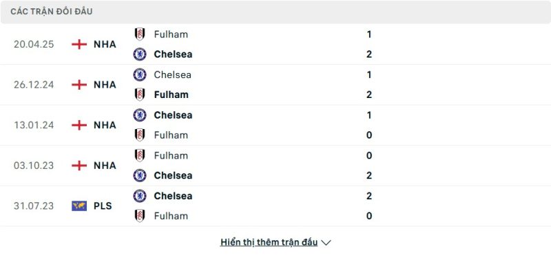 Thành tích đối đầu của Chelsea vs Fulham