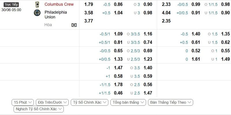 Bảng Tỷ lệ kèo bóng đá Columbus Crew vs Philadelphia Union