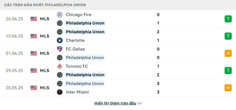 5 trận gần nhất của Philadelphia Union: W-W-D-W-D